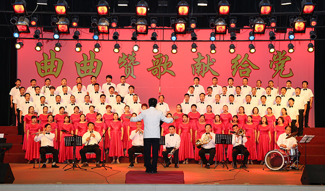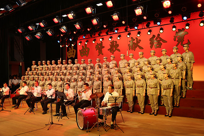 最后,集團(tuán)公司工會(huì)副主席賈志成上臺(tái)指揮,臺(tái)上隊(duì)員和臺(tái)下2000多名觀(guān)眾全體起立,共同唱響《沒(méi)有共產(chǎn)黨就沒(méi)有新中國(guó)》,現(xiàn)場(chǎng)紅旗舞動(dòng),歌聲洪亮,將整臺(tái)演出活動(dòng)推向了高潮。