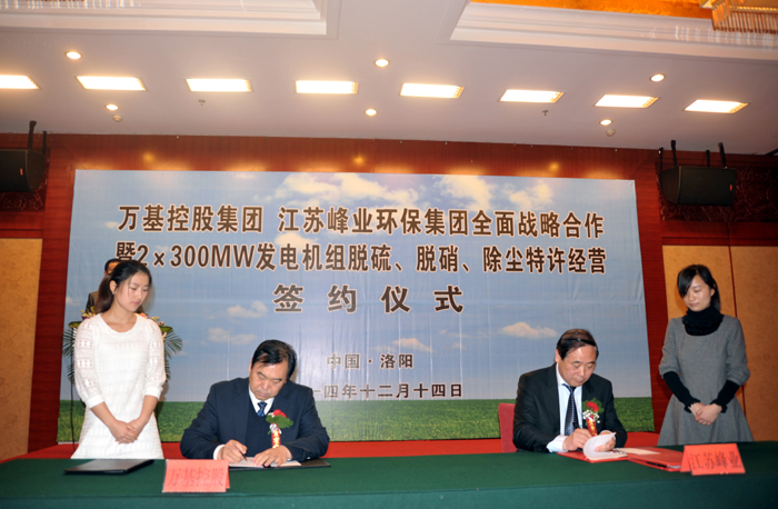 12月14日上午,萬基控股集團與江蘇峰業(yè)科技環(huán)保集團舉行全面戰(zhàn)略合作暨2X30萬千瓦機組脫硫、脫硝、除塵工程特許經(jīng)營簽約儀式,雙方將在發(fā)電機組的脫硫、脫硝、除塵等領(lǐng)域進行合作。江蘇峰業(yè)科技環(huán)保集團邀請出席的領(lǐng)導(dǎo)有中國環(huán)保產(chǎn)業(yè)協(xié)會副會長徐鳳剛、揚州市政府秘書長王逍宵、揚州市經(jīng)信委主任尤在晶、揚州市江都區(qū)常委副區(qū)長增萬忠、揚州市江都區(qū)發(fā)改委主任黃春濤、江都區(qū)高端裝備制造產(chǎn)業(yè)園管委會主任楊曉榮。洛陽市副市長王敬林、洛陽市發(fā)改委副主任王建中、新安縣委書記王玉峰、縣長郅書安、副縣長邵樂毅、縣產(chǎn)業(yè)集聚區(qū)主任樊棟梁、縣發(fā)改委主任李森和公司董事長李躍民、總經(jīng)理郭峰出席簽約儀式。