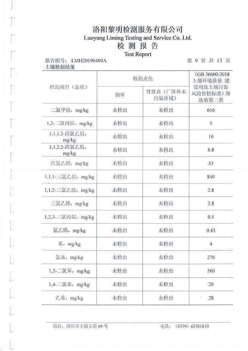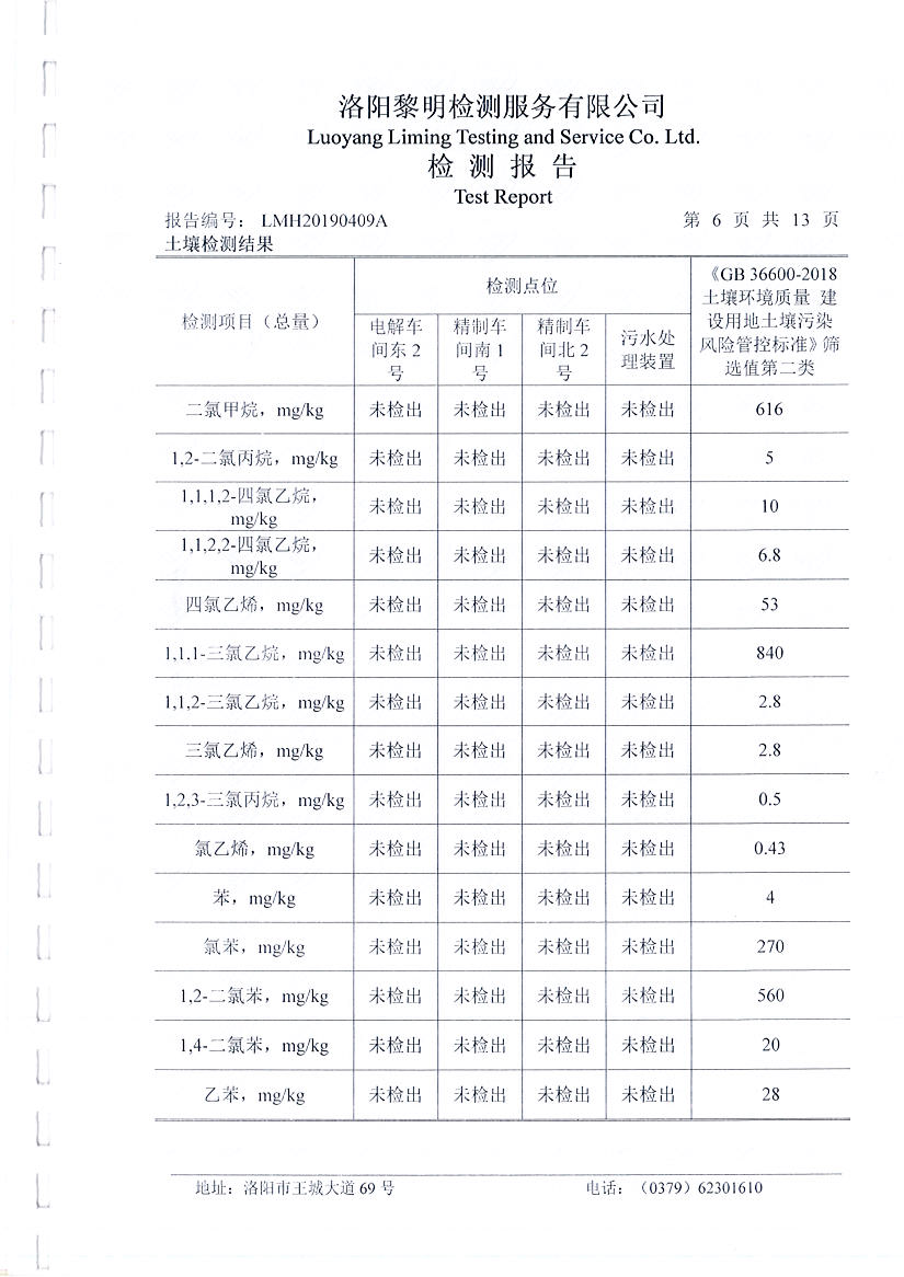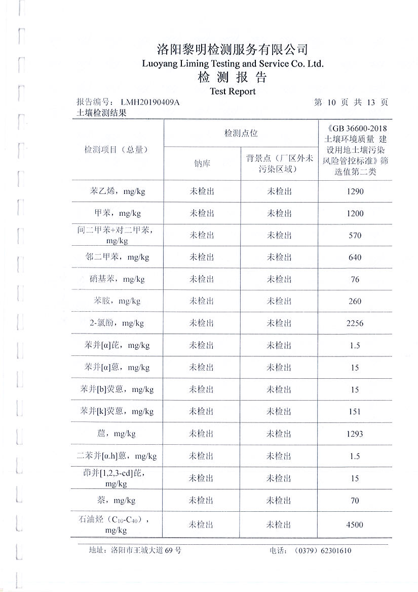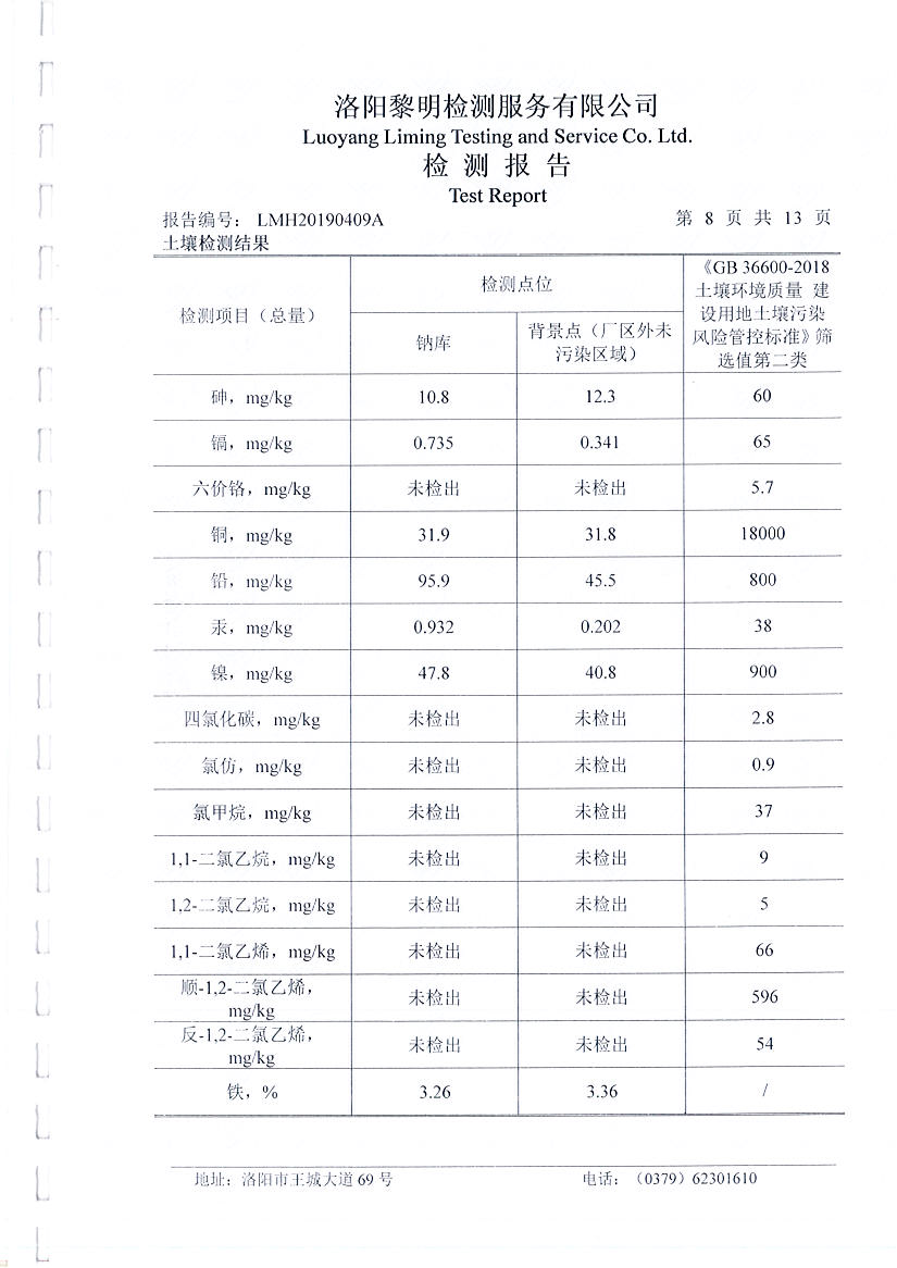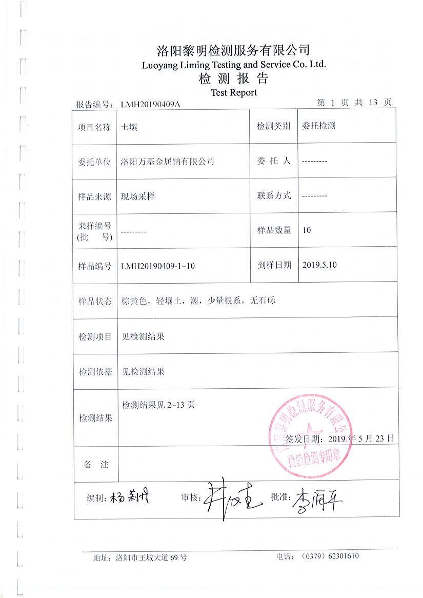 洛陽(yáng)萬(wàn)基金屬鈉公司土壤檢測(cè)報(bào)告公示