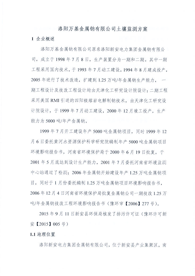 洛陽(yáng)萬(wàn)基金屬鈉有限公司2020土壤自行監(jiān)測(cè)方案