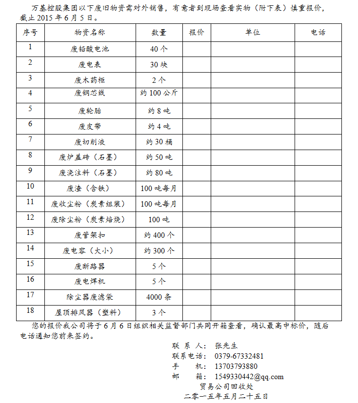 廢舊物資網(wǎng)上招標(biāo)銷售清單