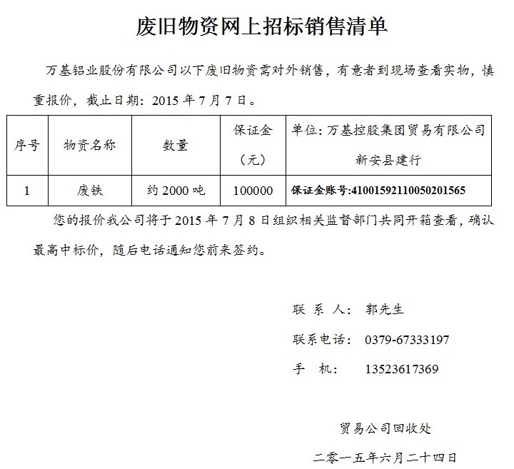 廢舊物資網(wǎng)上招標(biāo)銷售清單